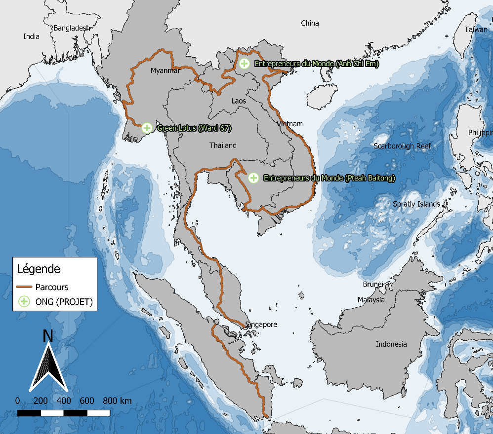 First, we will arrive by plane from Europe to Yangon, in the South of Myanmar. We will directly start by meeting the first NGO, Green Lotus, which is working on its project “Ward 67” located in the slums of the city. Secondly, we will drive to the northeast, to cross Laos and arrive in the Dien Bien region, where we are planning to meet Entrepreneurs du Monde and their Microfinance project in Anh Chi Em. Then, it will be time to travel south, following the Vietnamese coast. It will lead us to Cambodia where the second project of Entrepreneurs du Monde exists. After having met the second team, we will continue and finish our trip, aiming to the south until we reach Java in Indonesia.